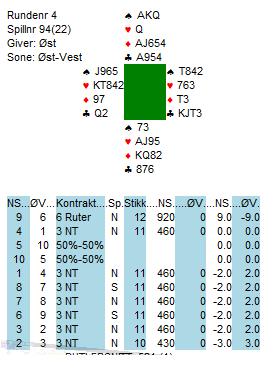 Tommy i Syd som nå har en makshand (14 hfp) valgte nå å melde denne som en minimumshand og meldte 3 spar . Etter systemet kunne han ha meldt 3 ruter, som viser tillegg og interesse for 4 spar med maks hos makker, men siden det ikke blir gjort har makker en obligatorisk pass. Denne gangen ble det skjebnesvangert. Videre meldingsforløp gikk dermed pass, pass og 4 kløver hos Gunnar Ødegård. 4 spar fra Tommy var selvfølgelig for sent nå, og Torbjørn Amdam hadde ingen problemer med å melde stampen 5 kløver.