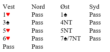 Her er det uansett opplagt å svare 1 spar siden vi jo godt kan ha ti-korts trumftilpasning i spar og bare åtte-korts tilpasning i hjerter. Og det er faktisk akkurat slik det er, for over 1 spar hopper vest til 3 spar! Det viser fire-korts sparstøtte og en hånd verd ca. 16 poeng, «give and take», og øst ser at slem skal meldes.