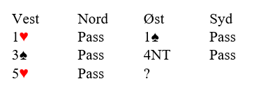Du sitter øst og hører makker åpner med 1 hjerter, minst femkorts farge. Ofte gjentar jeg til ferske spillere anbefalingen om at når man vet om en 8+ korts tilpasning i major, så holder det. Men med tre-korts trumfstøtte og en hånd god nok til utgang må man først melde en farge før det meldes utgang senere (åpneren kan jo være sterk), eller starte med å melde en ny farge for i neste melderunde kreve (for eksempel med 4.farge) for å etablere utgangskrav og undersøke slemmuligheter.