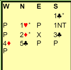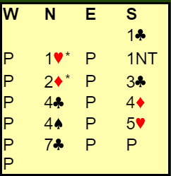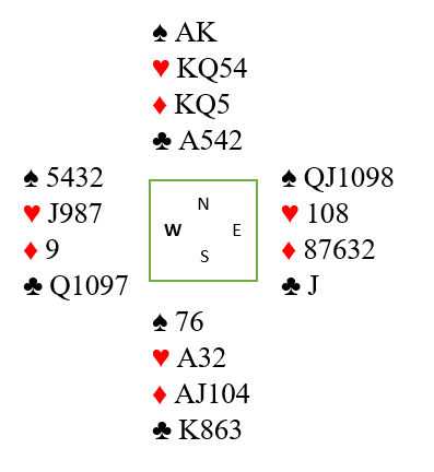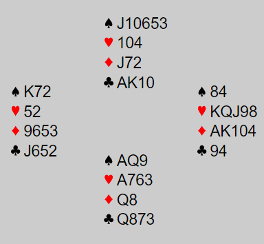 Åpningen var Multi, svake 2 i major eller en 20-21 grandhånd. Jan sin dobling viste ruterstyrke og min 2 NT var krav, jeg vet vi skal minst i utgang og Jan meldte 4 ruter « for det er det jeg har»- stilI gunstig sone kan det lønne seg om 7 stikk kan skrapes sammen. Nå hadde trolig Tormod lite bortkastet i ruter så jeg sjanset på 6 spar. Rundt til Johannesen igjen og tre trekk høyere, men skitt la gå og 7 ruter kom opp. Tre ekstra bet vil her koste 900 ekstra, men 500+ 900 er jo billigere enn 1430 hvis 6 spar står er logikken. Og det stemte siden Eva hadde enorm støtte i form av 4 kort ruter og en kløverfarge som matchet Jan sin hullete trekort «sidefarge». Alt vi fikk var 2 stikk i hjerter, 1 i spar og 1 i ruter. Da Tormod bare hadde singelton i kløver var 6 spar ikke til å rokke, men 7 ruter altså «god stamp», men det var mot en lilleslem som neppe blir meldt uten Jan sine sperreforsøk.