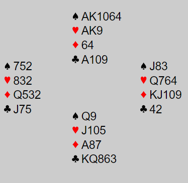 Damian valgte å spille på ruKx i Øst, men da Knut hadde 9-eren kostet jo den esset og Rene kunne ta beten med ru K i neste stikk. Øst hadde bare sp KDJ1096, tre hj, 2 ru og 2 kl- bare «hagel» utenom. Ergerlig for Wronski for ruter til esset og ny ruter løser jo problemene direkte siden Rene satt med ru KJ3 i Vest.