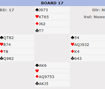 Vi var fornøyde med å komme oss i utgang, men ved det andre bordet meldte den uhyre farlige spilleren Michael Courtney (kjent av noen nordmenn, bl.a. fra robberklubben TGR i London) slem uten egentlig å vite om noen verdier hos nord i det hele tatt! Men han greide ikke å vinne den.