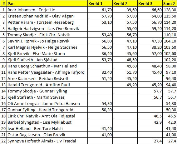 Frank og Runar vant med småpene 63,1% Men Oddvar og Åge møtte opp og kapret 2 plassen rett etter! Og når Kai og Morten kom på 3 plass med over 60% har de alle startet Klubbmesterskapet på en glimrende måte. Turneringen går over 6 kvelder, der alle kveldene teller.