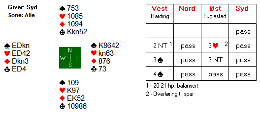 Vi ser at det er kritisk for forsvaret å etablere et kløverstikk før spillefører kommer inn og får satt opp et avkast i hjerter.