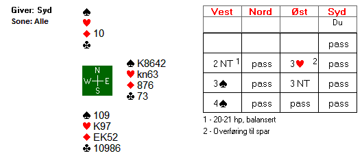 I det første spillet er vest spillefører i 4 spar etter å ha vist en balansert hånd med 20-21 hp. Makker spiller ut ruter 10 (norske/toppen av sekvens), og du skal som syd prøve å finne en vei til beit.