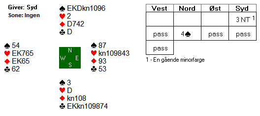 Uansett bruker jeg Peter Marstranders utsagn for å oppsummere dette spillet: «I praksis spiller vel de fleste tre ganger ruter, da spillefører er hjemme med trumfskift hver gang han har en kløver.»