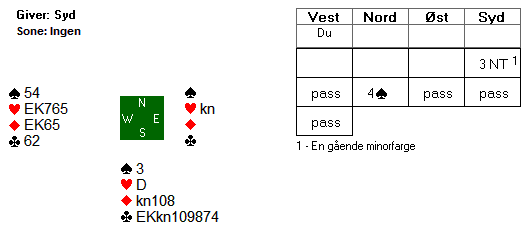 Dermed er det kløverfarga som gjenstår. Å åpne den gir aldri bort noe stikk, men åpner muligheten for å sette opp et stikk hos makker. Spillefører kan fort bli tvunget til å ta finessen på direkten. Kanskje får du muligheten til å gi makker ei ruterstjeling senere i spillet om det er det som skal til.
