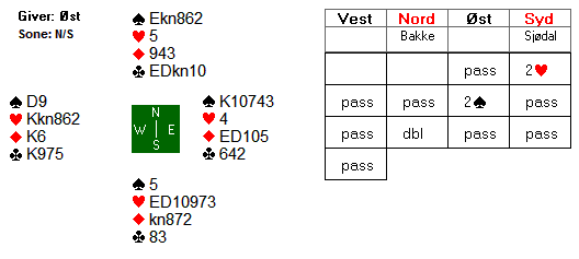 Dette er kanskje litt "enklere". Hjerter konge og konge - ess i ruter synes opplagt. Kongen for styrke med damen eller dobbel, du får neppe både i pose og sekk her (altså både styrke/svakhet OG fordeling). Esset etterpå gir god sjanse til å få beskjed om hva du skal fortsette med for å finne beten. Og du får i alle fall med deg en ruterrøff hvis den er der. Kløver i stikk 2 er litt for mye for meg, og trumf er å gi opp dersom spillefører har gående trumf og en kløver eller to.