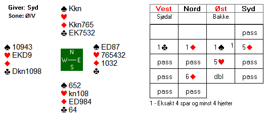 Det hele endte med to beit og 300 til Christian og Sofie. Denne scoren ga ikke mange poeng da en stor andel av parene hadde fått spille majorkontrakt i sonen øst-vest.