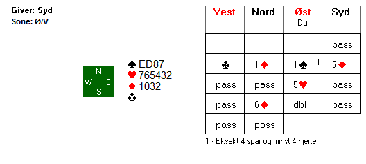 Christian fikk utspillsprøven mot 6 ruter dobla. Da valget falt på spar ess kostet det i teorien et stikk, men dette stikket fikk det lovende norske mix-paret fra Norge tilbake da spillefører ikke var påpasselig med å få tilstrekkelig mange stjelinger.
