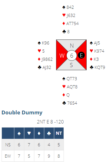 Ø/V-paret som satt mot det ergrer seg nok da vest burde funnet spar ut som effektivt tar knekken på den slemmen, det er bare elleve stikk uten ett i ruter. Uten å være brutal må det vel være lov å si at det neppe kan fnnes et bedre utspill mot 6 grand enn KQJ i en farge. Å bete 6 grand ville gitt Ø/V delt topp med ett par som satt mot 7 hjerter med en bet.