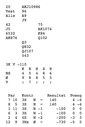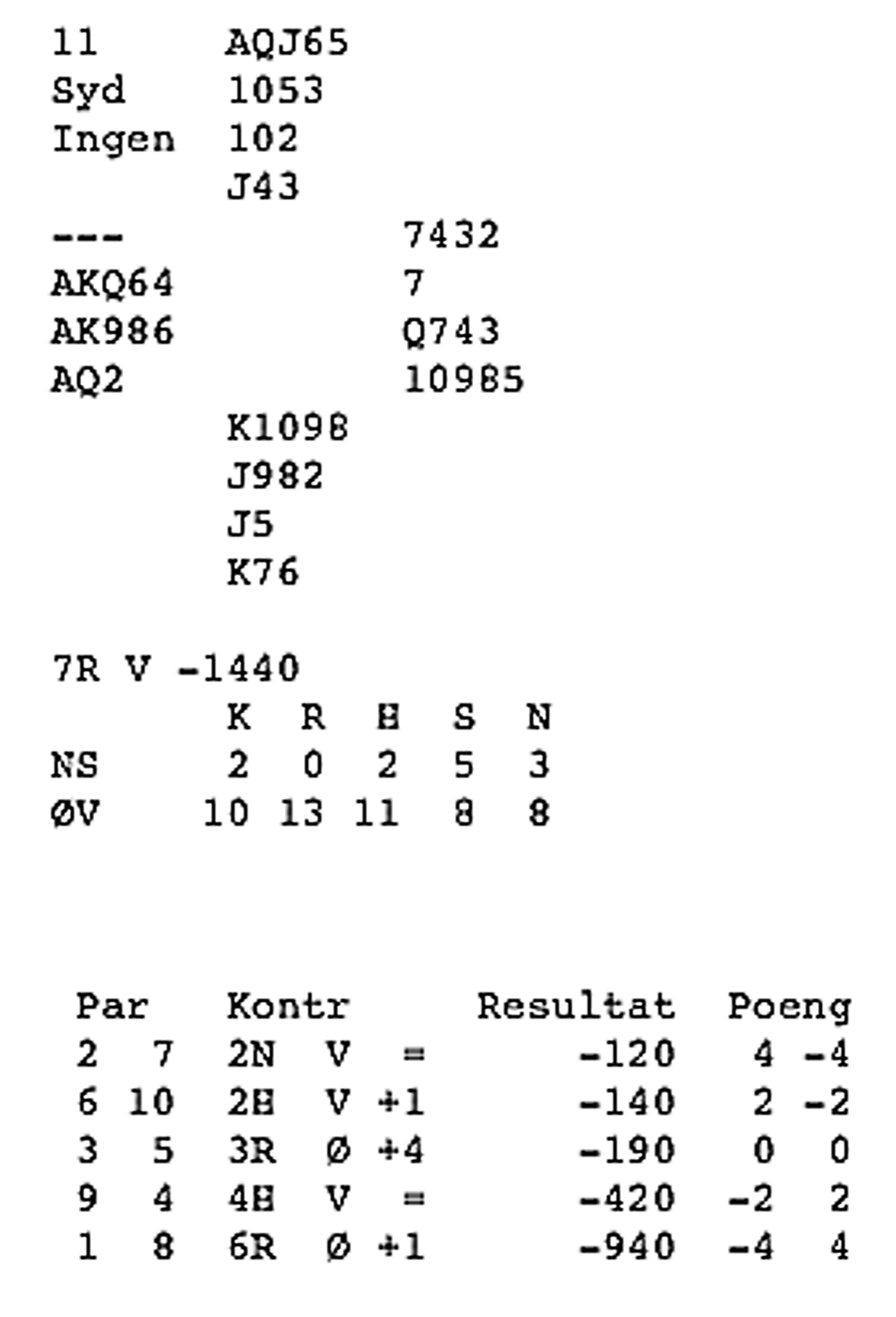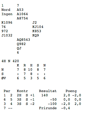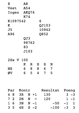 Til slutt var det aust-vest som hadde slem. 12 stikk i hjarterkontrakt denne gongen, og kun trumfen 3-1 imot gjorde at det ikkje var 13 stikk i dette spelet og.