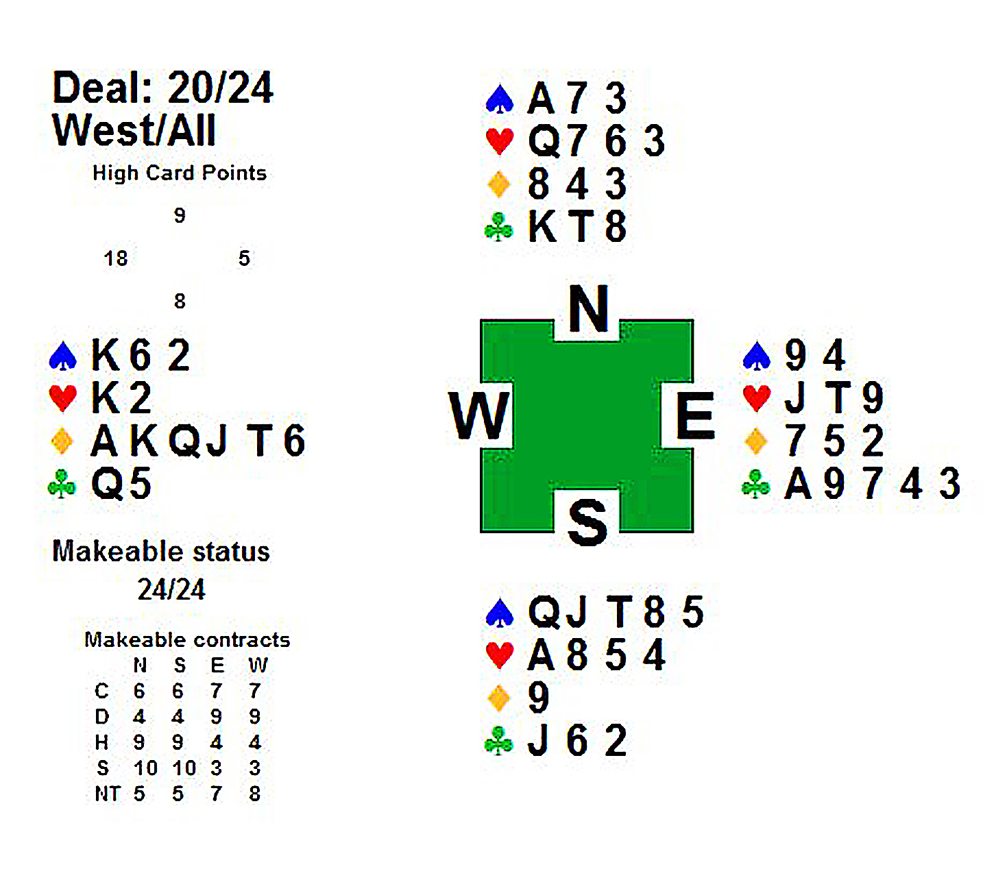 Joleiv og Jørn melde seg fort opp til 6 hjarter, med Joleiv i syd som speleførar. Spar kom ut, og esset vann stikket. Trumfen blei tatt ut i to rundar, og deretter tre rundar ruter frå bordet. Siste sparen på bordet blei så stolen på handa, og ruter-ess innkassert. To kløvertaparar ser ut til å vera uungåleg, men med litt hjelp frå motparten blei det berre ein. Kløver 7 frå handa, og når vest la kløver 3 var det bare å legga liten i bordet. Aust fekk stikket på kløver ti, men speleførar tok dei to siste stikka på kløver dame og kløver ess.