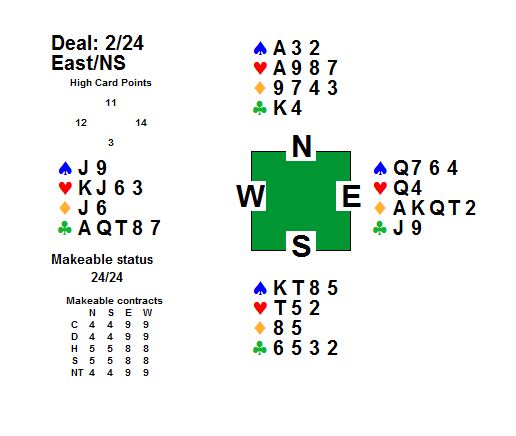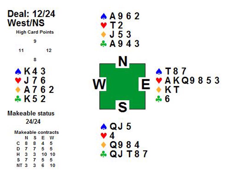Første spelet var det tolv stikk i hjarterkontrakt. Ingen nord-syd-par klarte å melda denne slemmen, men ein speleførar fekk i alle fall tolv stikk. Dei som fekk mindre stikk har sikkert prøvd sparfinessen, men beste speleplan er sikkert å spela tre gonger spar frå topp og bruka ruter konge som inntak til dei godspelte spar-stikka. Det gjev 5 sparstikk, 5 hjarterstikk og 2 ruterstikk så lenge begge majorfargane sit  3-2 hos motparten.