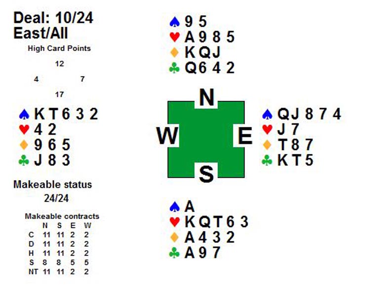 Spar kom ut frå vest, og aust fekk stikket for spar dame. Spar 10 fekk og behalda stikket (vest burde nok stukke denne, men gjorde det ikkje). Utan fleire spar å spela blei det hjartervri i stikk tre. Om syd no legg hjarter ti blir det jo ti enkle stikk når kløveren oppfører seg så fint som han gjer, men valet fall på hjarter dame og kongen i vest vann stikket. I fjerde stikk blei det sjølvsagt spelt ny spar, og syd kom inn på esset.