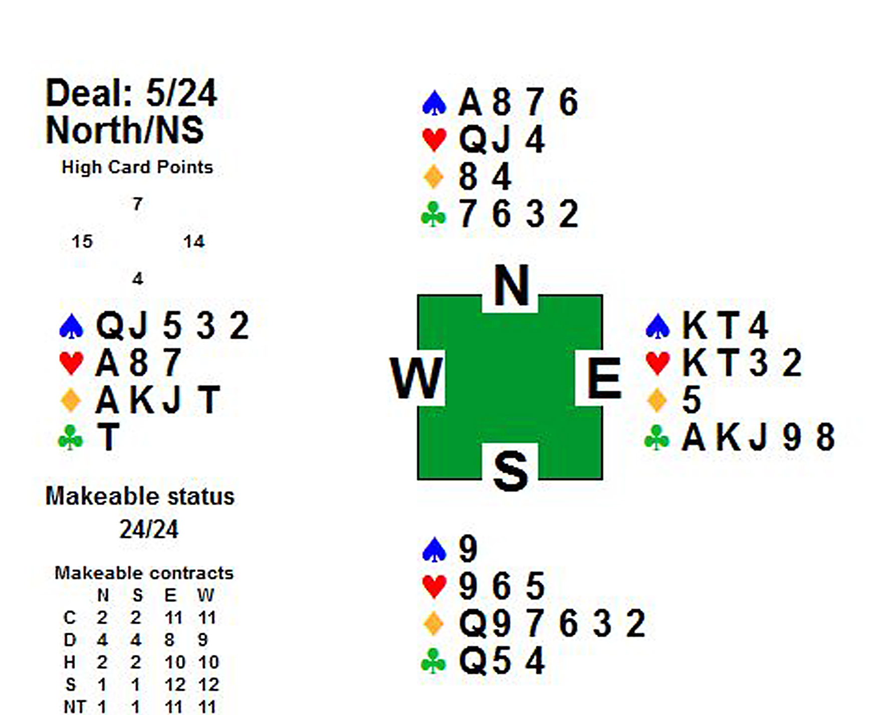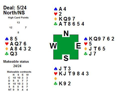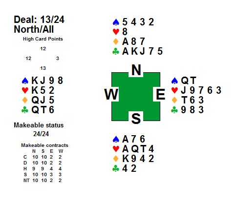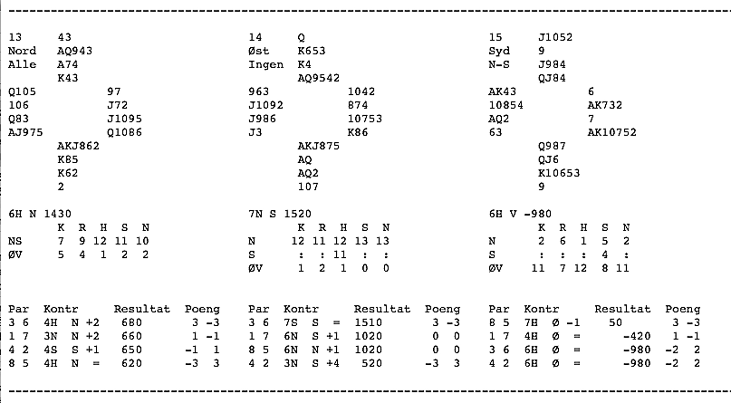 Neste spel var det enno fleire stikk, 13 i både spar og grand. 6 sparstikk, 3 hjarterstikk 3 ruterstikk og eit kløverstikk kunne innkasserast frå taket her.