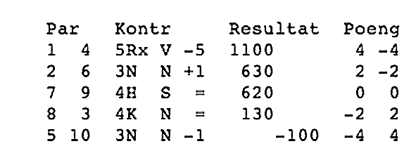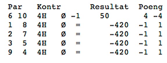 Resultata frå dei andre borda på spelet viser at fleire aust-vest par sleit i sparkontrakt: