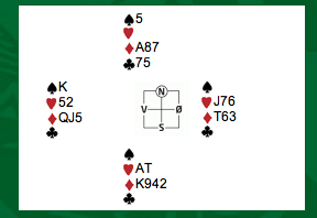 Anders legger liten hjerter i håp om att makker har en honnør i hjerter. Denne blir stukket med hjerter knekt. Liten hjerter til ess og hjerter konge. Så kløver til kongen liten kløver til damen ny kløver til borets ess. Så lenge syd har tre kløver blir siste ruteren i øst kastet på 4. kløveren som blir spilt fra bordet i stikk 9. Og dermed byttet vi plass på resultatlisten sammenlagt da dette var siste spill for kvelden. Hadde syd stukket liten hjerter fra øst med damen og tatt for ruter dame hadde kontrakten gått en bet.
