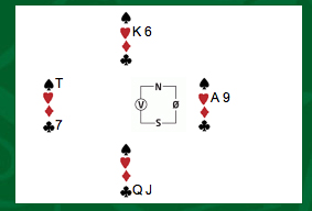 Syd har no sjansen til å brilliera og visa oversikt med å vri til ruter. Då bryt han ein viktig forbindelse mellom bordet og handa og skvisen blir ikkje mogleg å få til. Men det er ikkje lett å sjå etter stikk ein. Aktuelt blei det spelt ny hjarter.