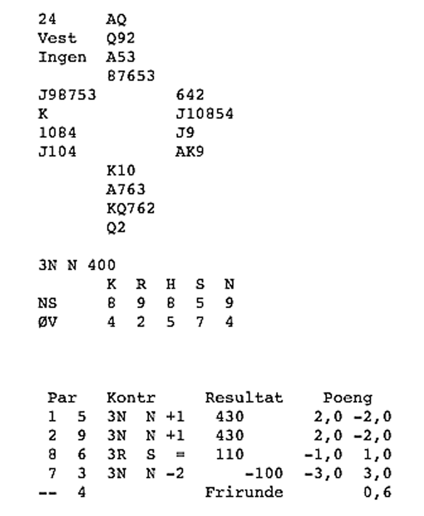 Kontrakten blei 3 NT på nord si hand, etter eit meldingsforløp der Anne Merete i aust hadde vore taus om sparfargen sin, medan Torhild i vest hadde vore inne med ei rutermelding. Med eit slikt meldingsforløp var ikkje ruter knekt ut frå Anne Merete unaturleg.