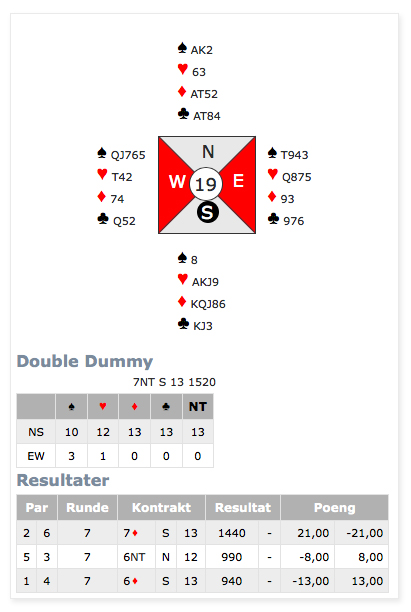 Motspelet har no fått 5 stikk, 2 i kløver to i ruter og eit i hjarter. Når nord no spelte den 13. ruteren til dobbeltrenons skulle ein tru at det sikra beiten. Enten måtte Stig trumfa på handa; då ville nord vera lengst i trumf, eller så måtte han trumfa i bordet, og då er det ingen trumf igjen der til å ta trumffinessen. (Nord har framleis konge-6 i hjarter).