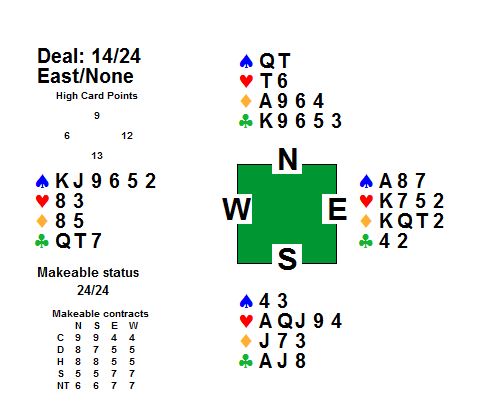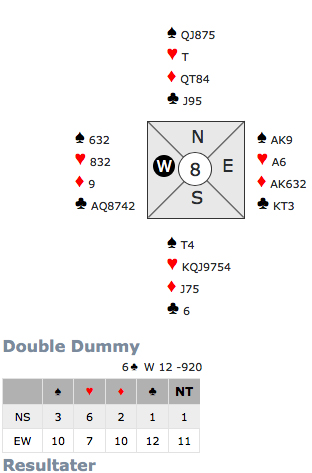 Etter pass i syd blei det opna 1 spar i vest. Nord gjekk inn med 2 kløver. Deretter melde aust-vest i fred og ro. Det bør vel i alle fall meldast minst 6 spar her, tolv toppstikk er laydown, men neppe urimeleg å gå mot storeslem med aust si hand etter opning i vest.
