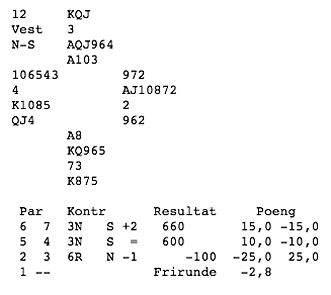 Etter hj konge var tatt valde syd å spela kl ess og kløver knekt som fekk behalda stikket. Liten kløver til kongen og no var det berre å spela ruter. Då vest dukka opp med ruter ess, var han no innspelt. Speler han ruter får syd kasta ein spar på 5 ruteren i nord. Legg han ned spar ess står kontrakten også. Vest valde å ta på spar ess og 11 stikk til nord-syd