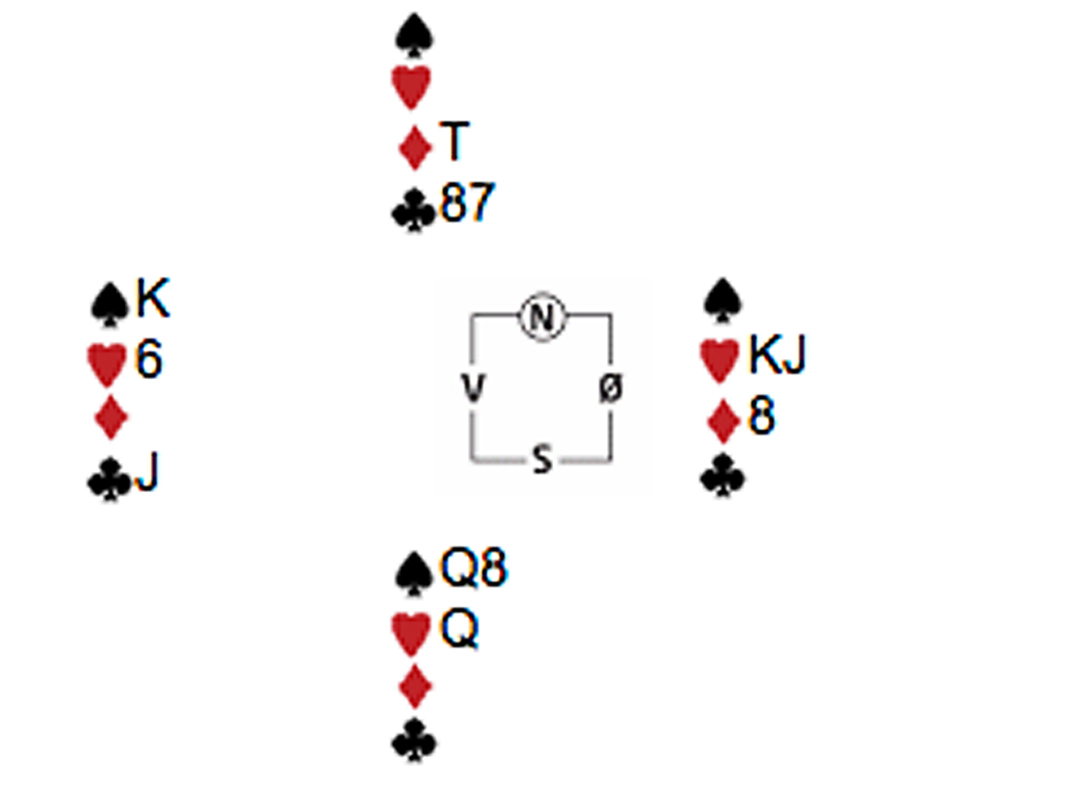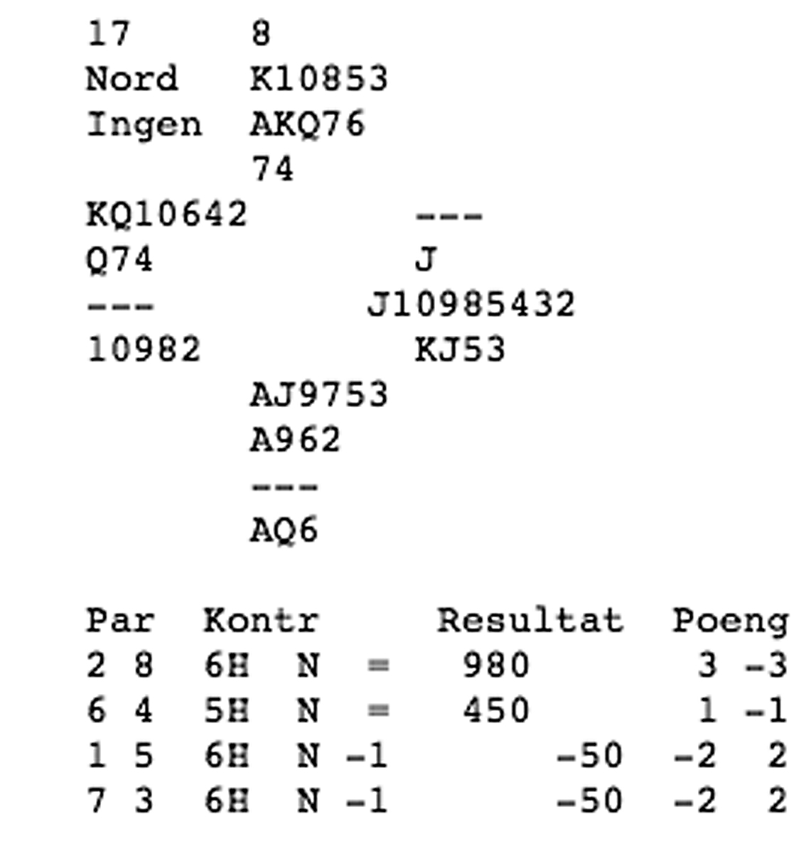 Olav i vest blei speleførar i 1 NT, og Inger Marie i nord spelte ut ein liten hjarter. Vilhelm i syd stakk med esset og vrei til spar dame. Olav la liten tre gonger, og Inger Marie kom inn på spar-esset etter tre gonger sparspel og fortsatte i femte stikk med hjarter til Olav sin konge. Alt låg no til rette for ein skvis mot nord i hjarter og kløver. Med ruter frå topp er stillinga denne med tre kort igjen: