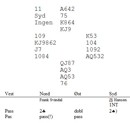 Så kom dette spillet og historien starter i spillet før, spill nummer 10 av 12. De hadde sinnsykt dårlig tid, omtrent 11 minutter på tre spill. Frank satt i nord og det gikk tre passer fram til han. Mange ville åpnet på korta, men et kikk på klokka gjorde valget enkelt, "PASS"