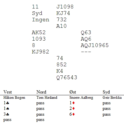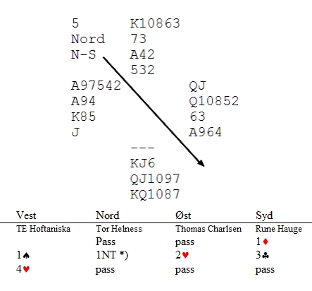 Når spillet var ferdig, kom det for en dag at Tor ikke hadde kløver, men hadde meldt 1NT naturlig. Da mente vest at hvis han visste at det var sparhold bak han, ville han kun invitert til utgang, ikke hoppa til 4hj. Han sa også at makker ville ha passa invitten. Jeg tror ikke noen spurte hva Rune Hauge ville meldt over 3hj, men 4kl ser da ikke dumt ut? Står det ikke nesten 5kl i syd?