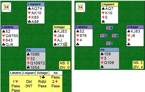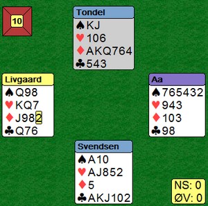 Det kom kløver ut til esset og ruterkongen som fikk beholde stikket. Mer ruter til esset og kløver til vest sin dame. Enda en kløver og nå sto det!! Øst tok sitt siste kløverstikk og var faktisk innspilt. Han kan ikke spille spar og hjerterknekten setter opp en finesse.  Derfor hjerter fire til dame og esset. Tror du ikke Allan tok for spar esset (Vienna Coup) og skviste øst i major. Hjerter ti tok siste stikk!!