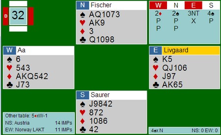Terje Aa åpna med svake to ruter. Det må vel være en makshånd? Det er alltid er fordel å ha beskrevet hånda si med en eneste melding og Terje kunne bare legge på grønne lapper etterpå og regne med at makker tok gode (og rktige) avgjørelser. Allan meldte først 3NT som er kabal og dobla så 4sp for 300. 11 IMP til Norge etter gode avgjørelser på begge bord.