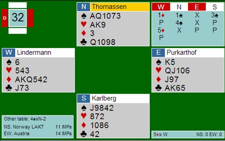 Her er et typisk spill for Karlberg - Thomassen. De setter press på motparten, uten at det er hals over hodet det de holder på med. Vest har åpnet tynt med fordeling og må ta stilling til makkers styrkevisende dobling av 4sp. Jeg vet ikke hva slags åpningsmeldinger ØV bruker, men vest har i alle fall minst to rutere mer enn han har vist. Alle poengene i en farge er heller ikke noen styrke i motspill. 5ru kosta 200.