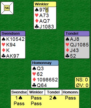 Av en eller annen grunn skifta Petter tilbake til ruter til bordets ess og nå sto det igjen ved å ta ut trumfen (med den markerte finessen). Som jeg fortalte i innledningen var ikke Syd noen toppspiller, så han så ikke muligheten for å unngå hjertertaper og la seg på et par beit. Da ble det 11 IMP til Norge, om enn noe ufortjent.