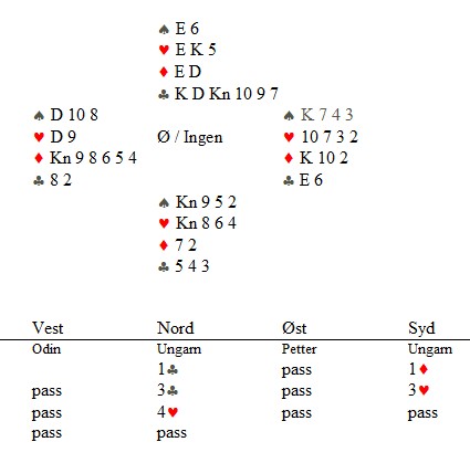 Så til motspillet mot 4hj. Odin fant ruter ut til dame og konge. Det kan se ut som mer ruter er best, men da tar spillefører for EK i trumf. Nå D9 faller i vest, er det opplagt hvordan fargen sitter. Da presses kløveresset ut og øst må spille ruter. Alt annet gir kontrakten lett med hjerterfinessen. Ruteren stjeles på hånda og han tar for hjerter knekt før han spiller inn bordet i kløver. Øst kan stjele, men har ikke mer ruter. 10 stikk.