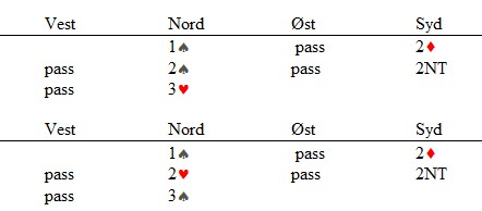 Hva er det som skiller de to meldingsforløpene under? Har syd fire hjerter i det første? Er det noe forskjell i honnørstyrke? Mailadressen finner du på LIVE-Magazinet om du trenger.