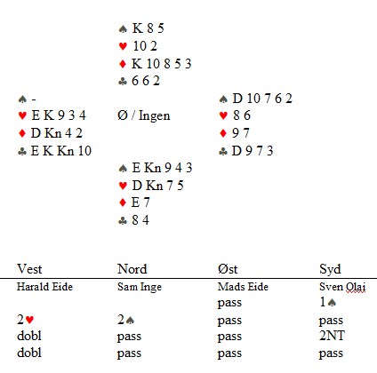"Eg var redd for at makker hadde 3 korts hjarter og kanskje dårlegare spar slik at det kjem ut E og K i hj, hj til steling. Deretter kjem vest inn i minor og endå ein hj. Difor tok eg ut i 2NT.
