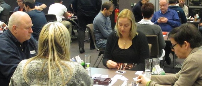 Paula Leslie som spillefører. Makker er Sølvi Remen. Motspillere Tormod Røren og Ida Wennevold: