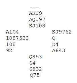 No har Sam Inge ikkje råd å trumfe sparen for i så fall får syd ein høyning når ein skal stele seg heim i kløver. Difor hjarter mot bordet. At ikkje syd trumfa ruter 10 saman med at om det er 109 blokk i hj hos nord, så har vi ein posisjon for begrensa val gjorde at han tok finessa  med hjarter 7 (!).  Deretter kløver til høg steling og bordet står. Svært nøyaktig speleføring!