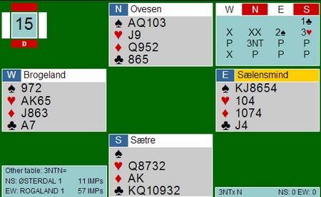 Noen kikka ned på en sparhonnør og godt med honnørpoeng og meldte derfor 3NT rett inn. Andre søkte og fant (dessverre) makker med fem hjerter. Ser du under og litt til venstre skjønner du fort at 4hj ikke var rett kontrakt.