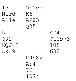 Makker Håkon Bogen spilte ut spar to til esset og spar til stjeling. Så ruterkongen fra bordet. Nå tenkte jeg slik at Allan ville spille ruteren fra bordet slik at jeg ikke kunne se hvor mange syd hadde og derfor lasjere feilaktig. Han kunne godt ha singel, så jeg turde ikke annet enn å stikke med esset. Makker la syveren og jeg så at det var feil å stikke. Nå hadde Allan et inntak på ruter 10 og kunne bruke den som overgang til enda en sparstjeling.