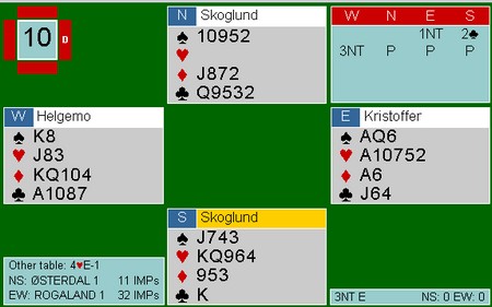 Øst kunne stjele med sin nest siste trumf, men hadde ikke mer kløver. Nå kunne Roald ta seg inn på hånda med ruteress, ta ut den siste trumfen og avslutte med to spartasser for elleve stikk..