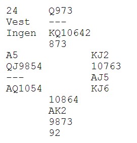 PS: Dette er en feilanalyse av meg. Espen Erichsen mailer og forteller at med ruter ut, tar han EK i den fargen og spiller kløverkongen. Når kløveren sitter, er det ni lette stikk. Hjerter ut beiter når vest stikker og spiller spar hver gang han er inne..