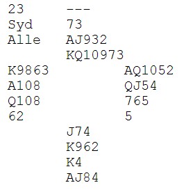 Dette spillet skriver Nils Kvangraven om på sin side der Bjørn Bentsen vinner 6ru etter spar ess og mer spar i utspill. Han røffer med kongen og kapper ruter på tieren. Så litt fram og tilbake for to hjerterkapper og tolv stikk.