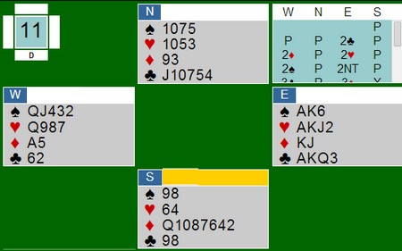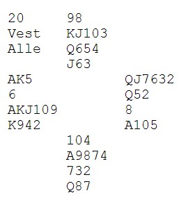 Å stoppe i lilleslem var sikkert på grunn av dårlige vurderinger, men enklere storeslem enn dette når det går 2kl-2sp, finnes ikke.