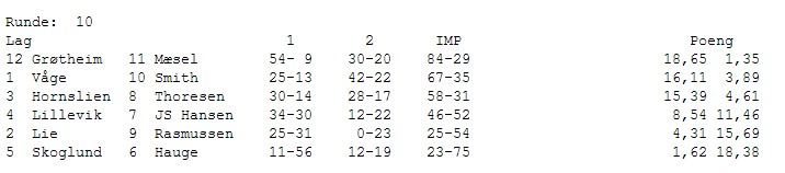 Gratulerer med et suverent mesterskap til Hauge. Grøtheim får i de siste spillene inn akkurat de IMP'ene de trenger for å ta andreplassen. Det samme gjør Rasmussen og de kniper bronsen foran et skuffet lag fra Møre. Det som en stund så ut til å bli gull, ble til slutt en sur fjerdeplass.