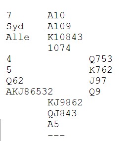 Det var aldri i mitt hode at Allan Livgård kunne meldt slik med fem honnørpunkter. Han ser riktignok at det er god tilpass siden makker har 0-3-5-5- eller 1-3-5-4, men han har da ikke vist sånt tillegg? Allan håpet sikkert at makker hadde ingenting i spar og derfor mer i hjerter. Syd kunne ha en honnør eller to som kanskje satt i kapp?
