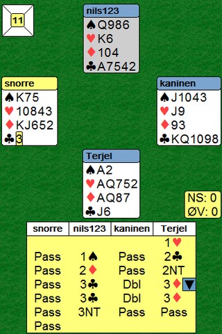 Jeg tenkte at hvis det er en som har fire ruter, er det i alle fall ikke han som la åtteren. Derfor le jeg ned knekten og kontrakten kunne ikke vinnes lenger når Nils stjal med åtteren.