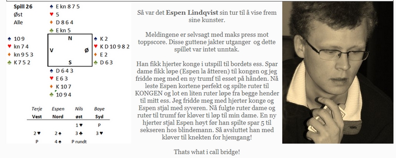 Nå fikk Boye slippe til med en invitt for sin side når han meldte 3hj. Espen Lindqvist er ikke tung å be, ikke minst fordi det kunne se ut som makker hadde singel hjerter og at siden ØV hadde hjerter/kløver, kunne makker godt ha noe rutertilpass. (KJx i ruter hadde gjort spillet nedbrett)