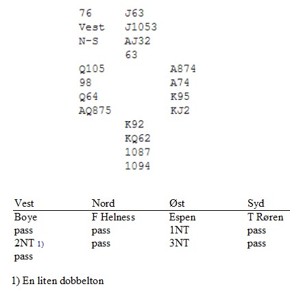 Fredrik Helness spilte ut hjerter 6 (norske) til tieren hos Tormod Røren og Espens ess. I stikk to fulgte en liten spar, og Fredrik la raskt liten for ikke å røpe sparsitsen (i teorien kan spillefører være avhengig av å gjette sparen). Men det var akkurat den dukken Espen trengte! Han hadde bare sju sikre stikk og måtte etablere ett stikk både ruter og spar uten å gi bort et sparstikk (i tillegg til at hjerteren måtte sitte 4-4). Derfor stakk han opp på spar dame og kunne deretter etablere sitt niende stikk i ruter.